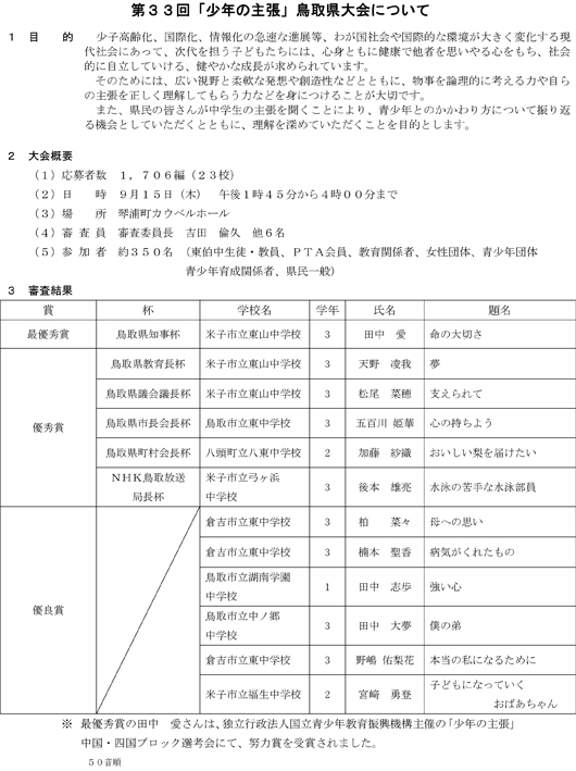 題 名「命の大切さ」 米子市立東山中学校 3年 田中 愛