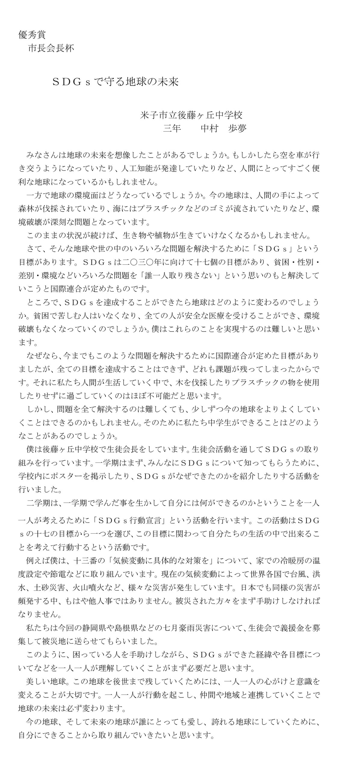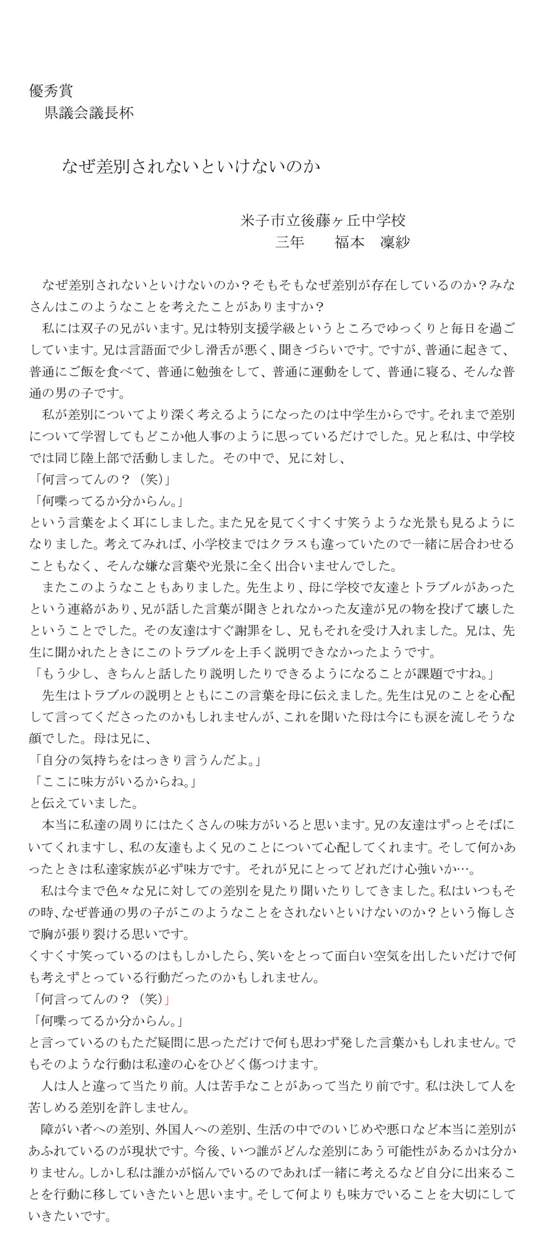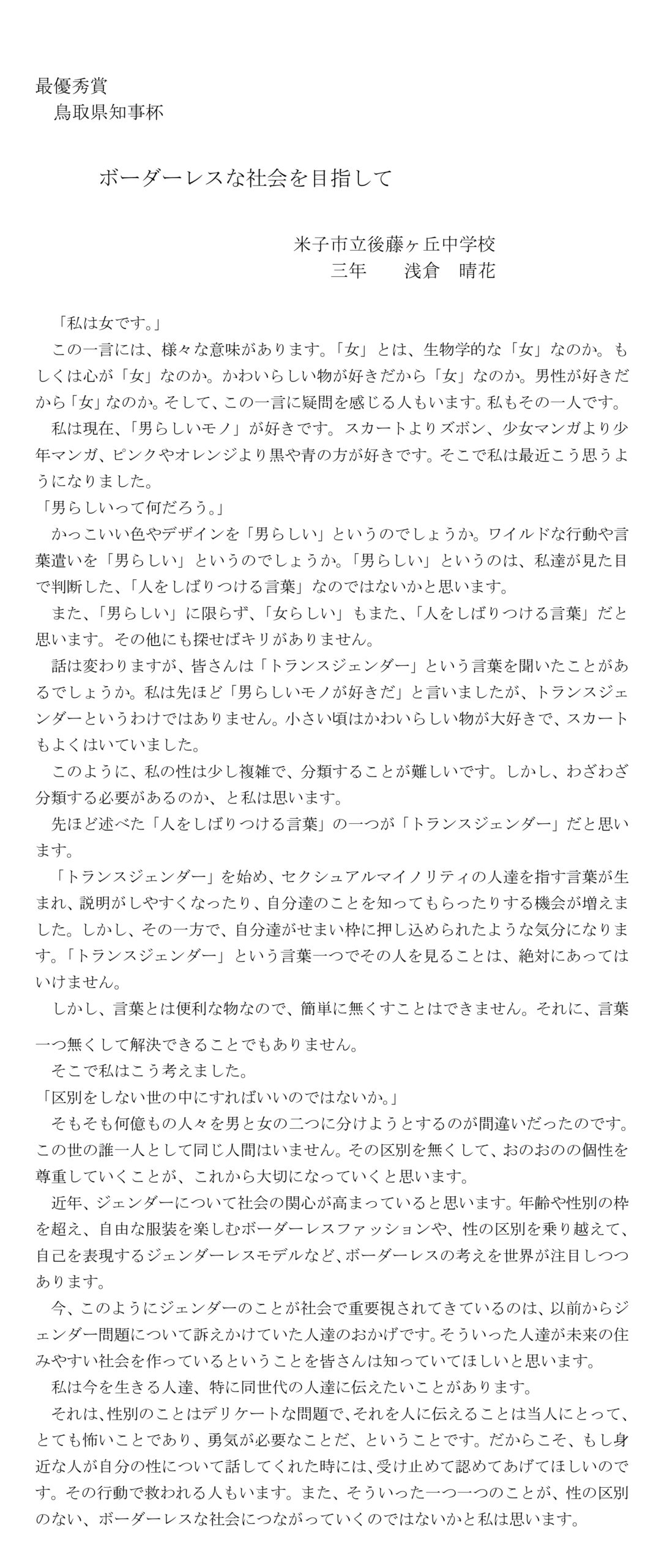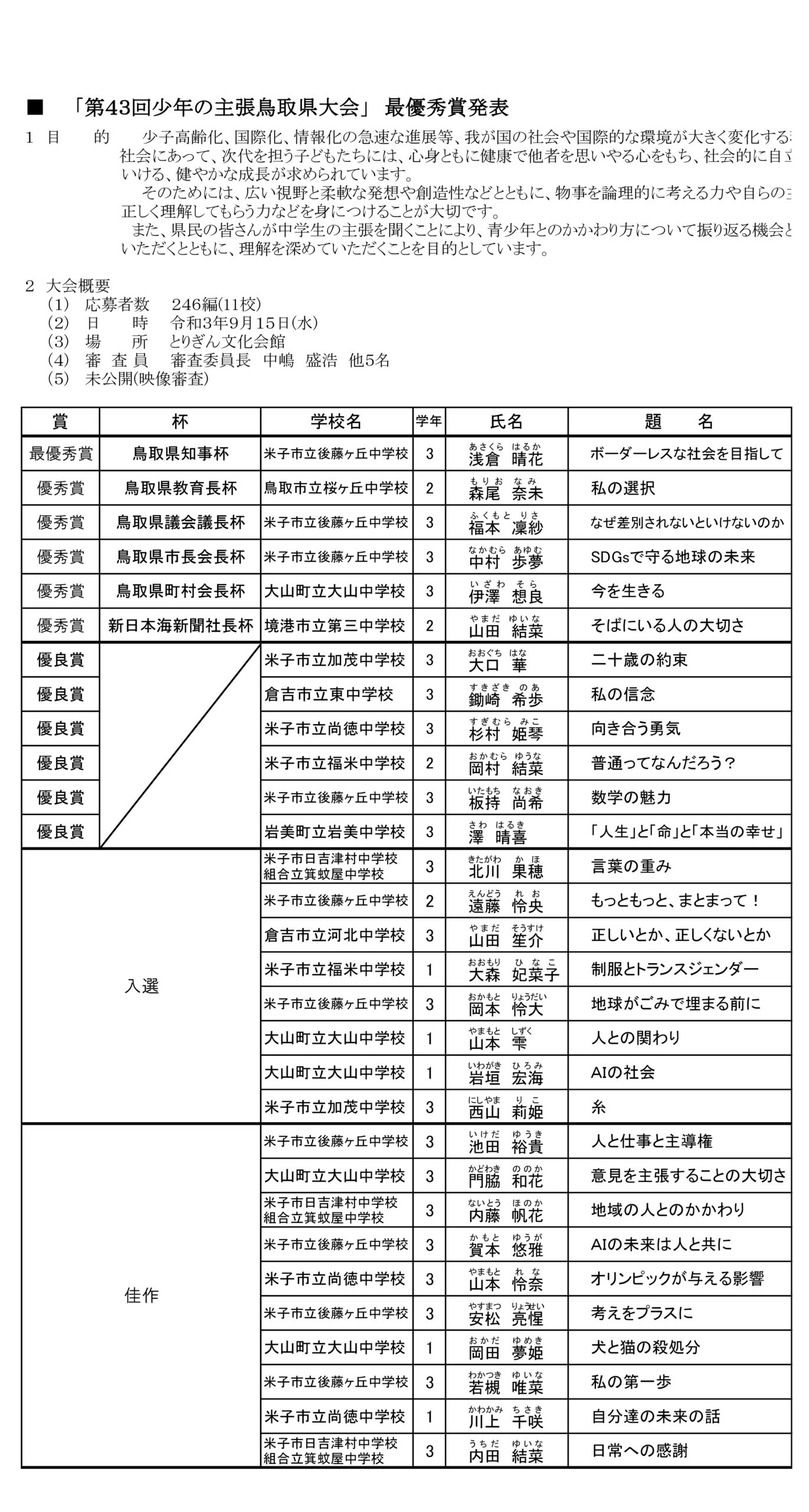 令和3年度 「第43回少年の主張鳥取県大会表彰式及び県知事杯授賞者等主張発表」
